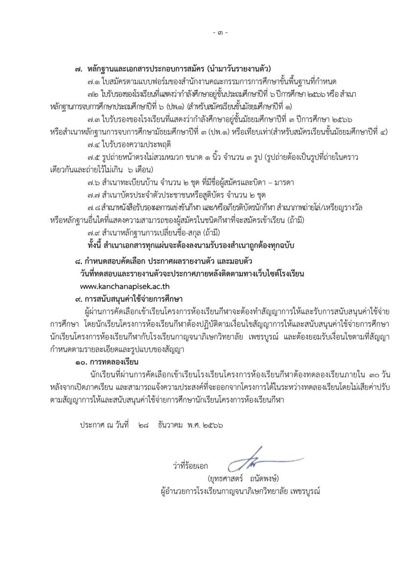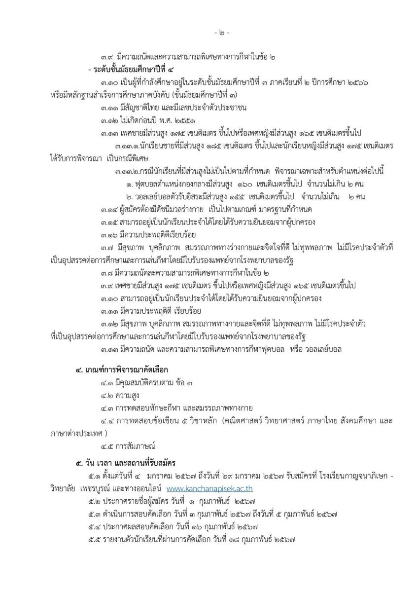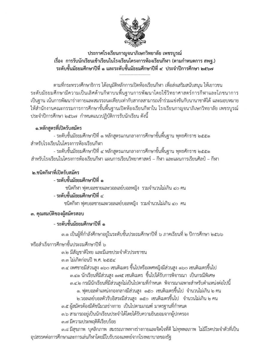 ประกาศรับสมัครสอบ ห้องเรียนกีฬา นักเรียนระดับชั้นมัธยมศึกษาปีที่ 1 และปีที่ 4 พร้อมนักเรียนระหว่างภาค ปีการศึกษา 2567