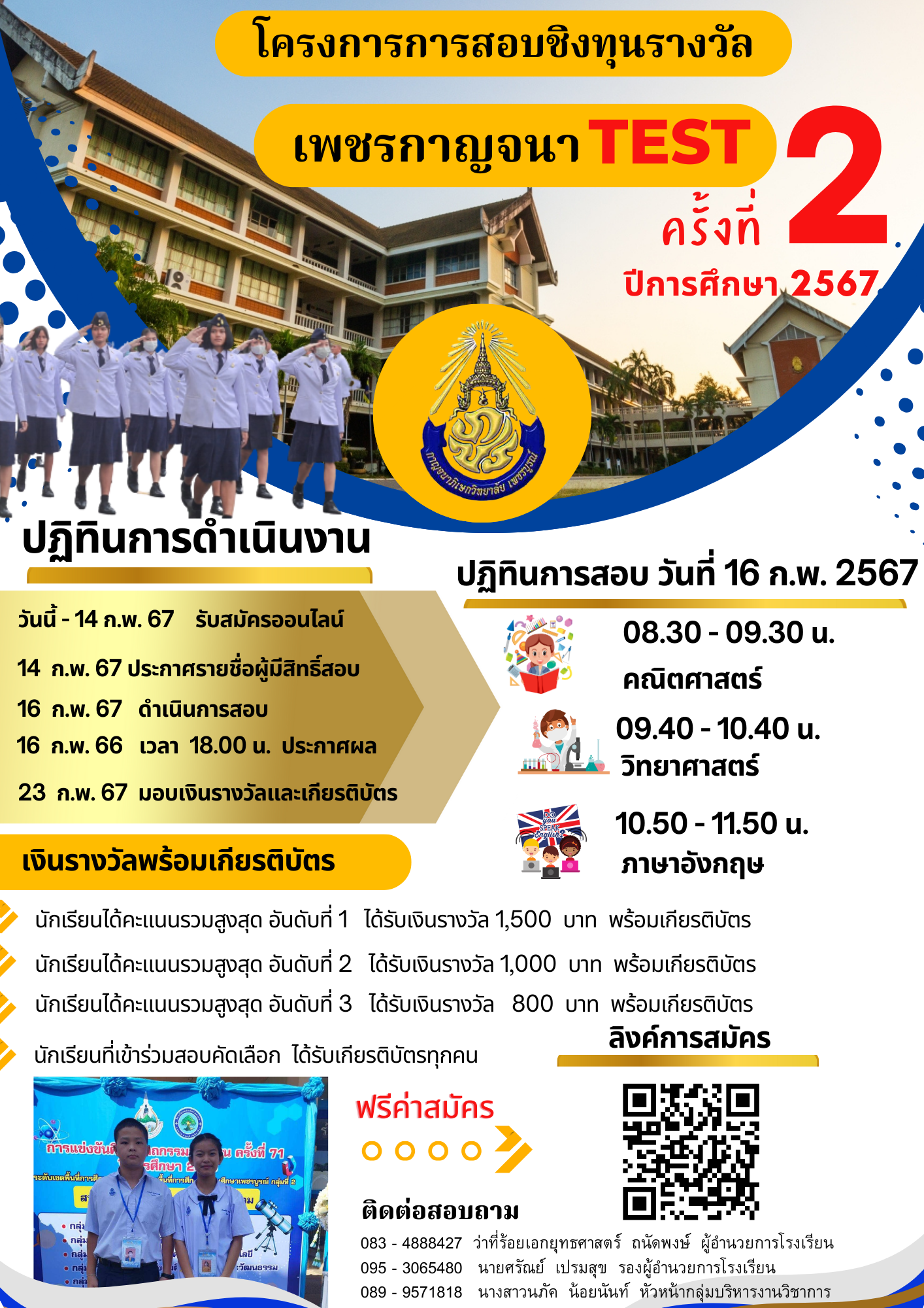 ประกาศ รับสมัครสอบชิงทุนเพชรกาญจนา ครั้งที่ 2 ปี 2567 สำหรับนักเรียนระดับชั้นประถมศึกษาปีที่ 6 ที่มีความสนใจสอบวิชาคณิตศาสตร์ วิทยาศาสตร์ และภาษาอังกฤษ เพื่อชิงเงินรางวัล พร้อมเกียรติบัตร (ผู้สมัครทุกคนได้เกียรติบัตร)