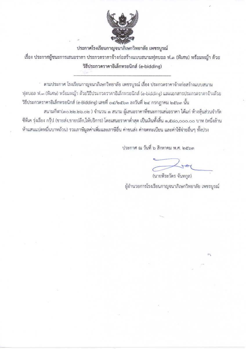 ประกาศผู้ชนะการเสนอราคา ประกวดราคาจ้างก่อสร้างแบบสนามฟุตบอล ฟ.๓ (พิเศษ) พร้อมหญ้า ด้วยวิธีประกวดราคาอิเล็กทรอนิกส์ (e-bidding)