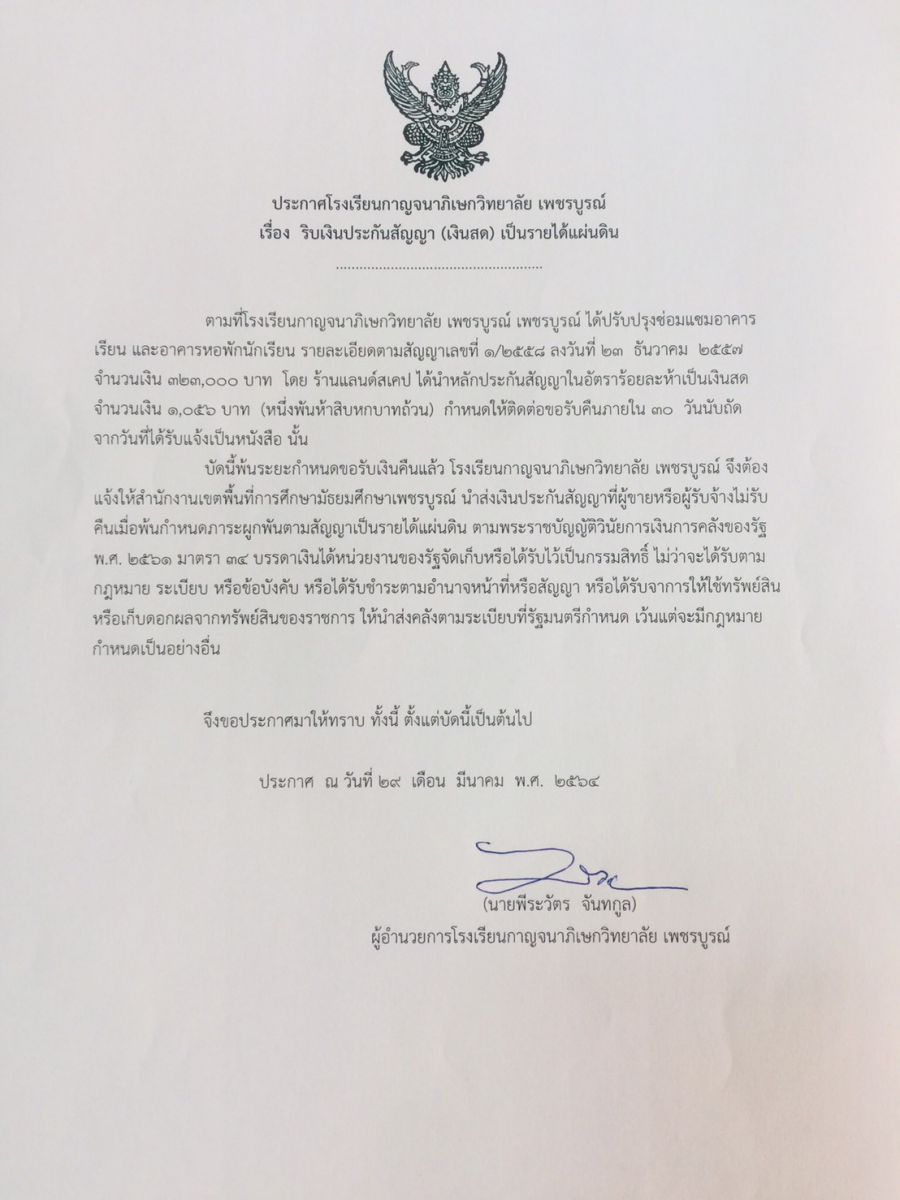 ประกาศโรงเรียนกาญจนาภิเษกวิทยาลัย เพชรบูรณ์ เรื่อง ริบเงินประกันสัญญา (เงินสด) เป็นรายได้แผ่นดิน